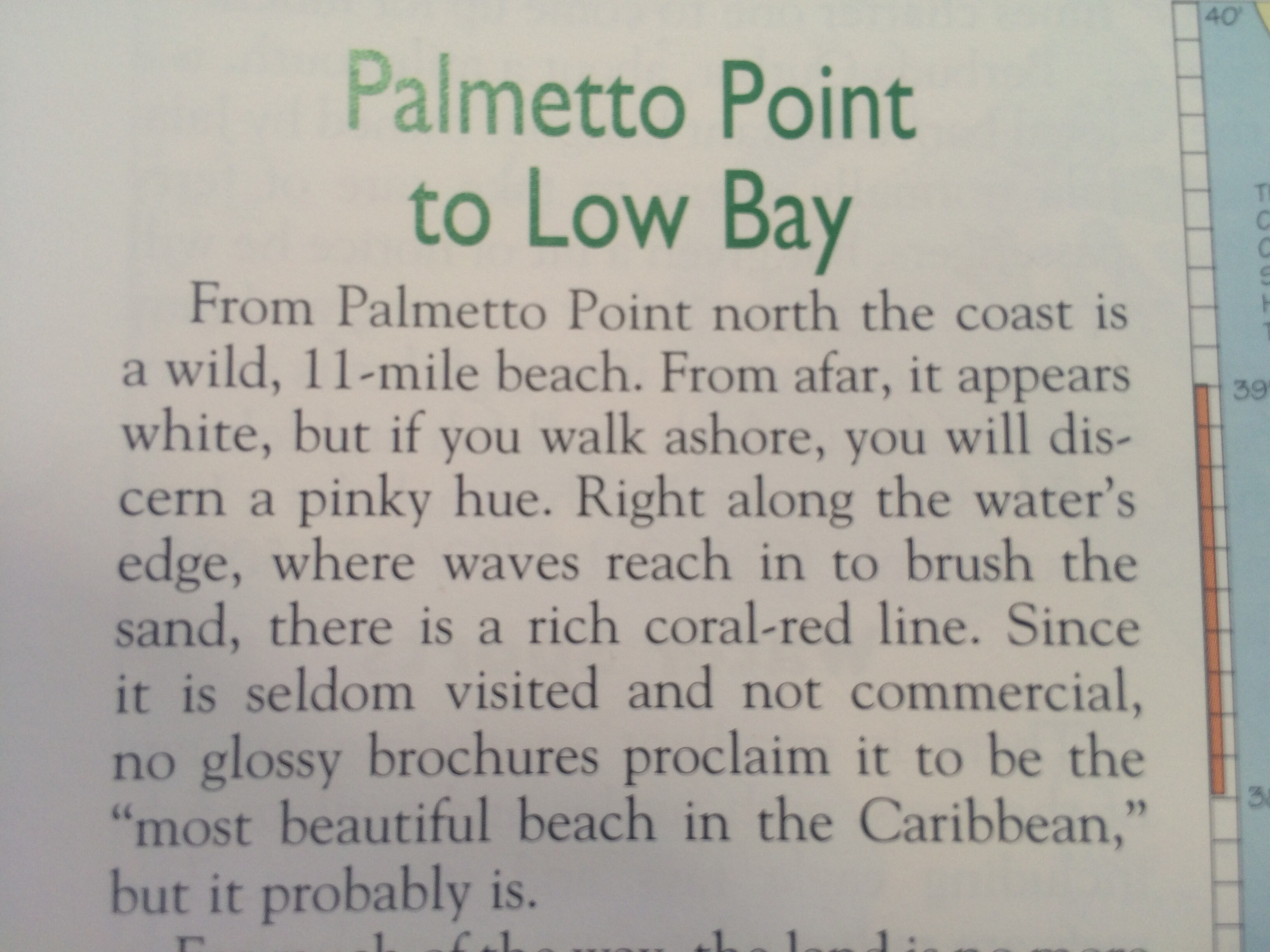 The next day we sailed 14 miles North along the coast, around Palmetto Point and anchored inside Tuscon Rock along Low Bay Beach. Here is what the ChrisDoyle Crising Guide says about this stretch of the island.