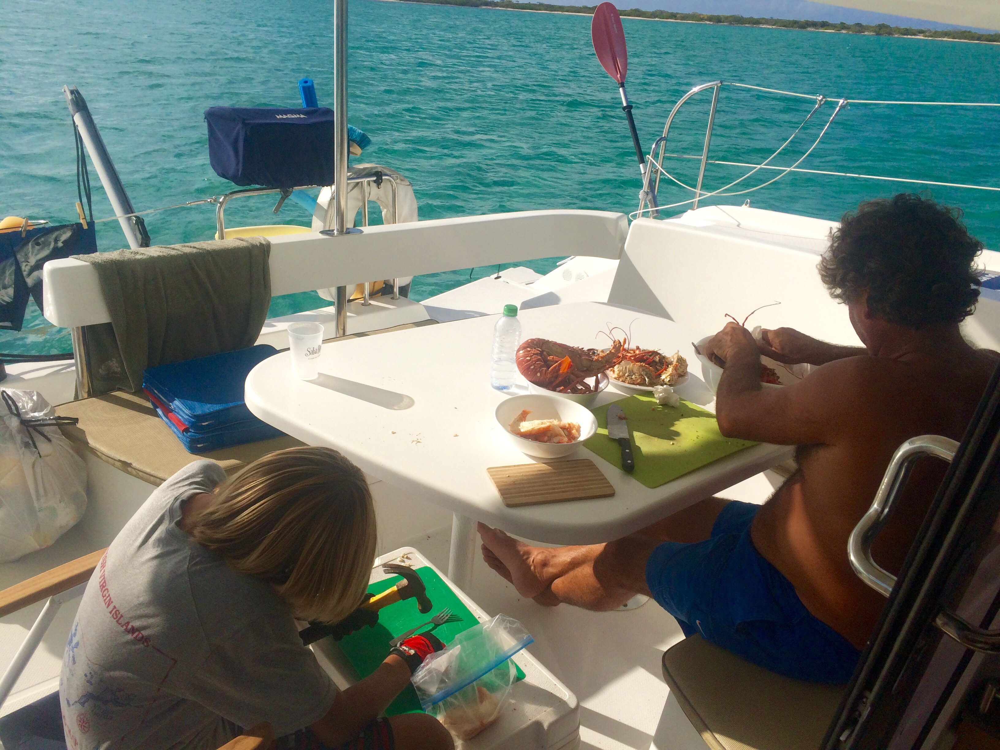The water was the clearest that we have seen yet. The anchorage was so peaceful that we decided to stay a second night. We spent the extra day snorkeling, kayaking and just enjoying the tranquility of the water and privacy. In the late afternoon, a fishing boat came by selling more Lobster. So, Rich purchased several more and we spent the remainder of the afternoon cooking and cleaning lobster to fill up our freezer.