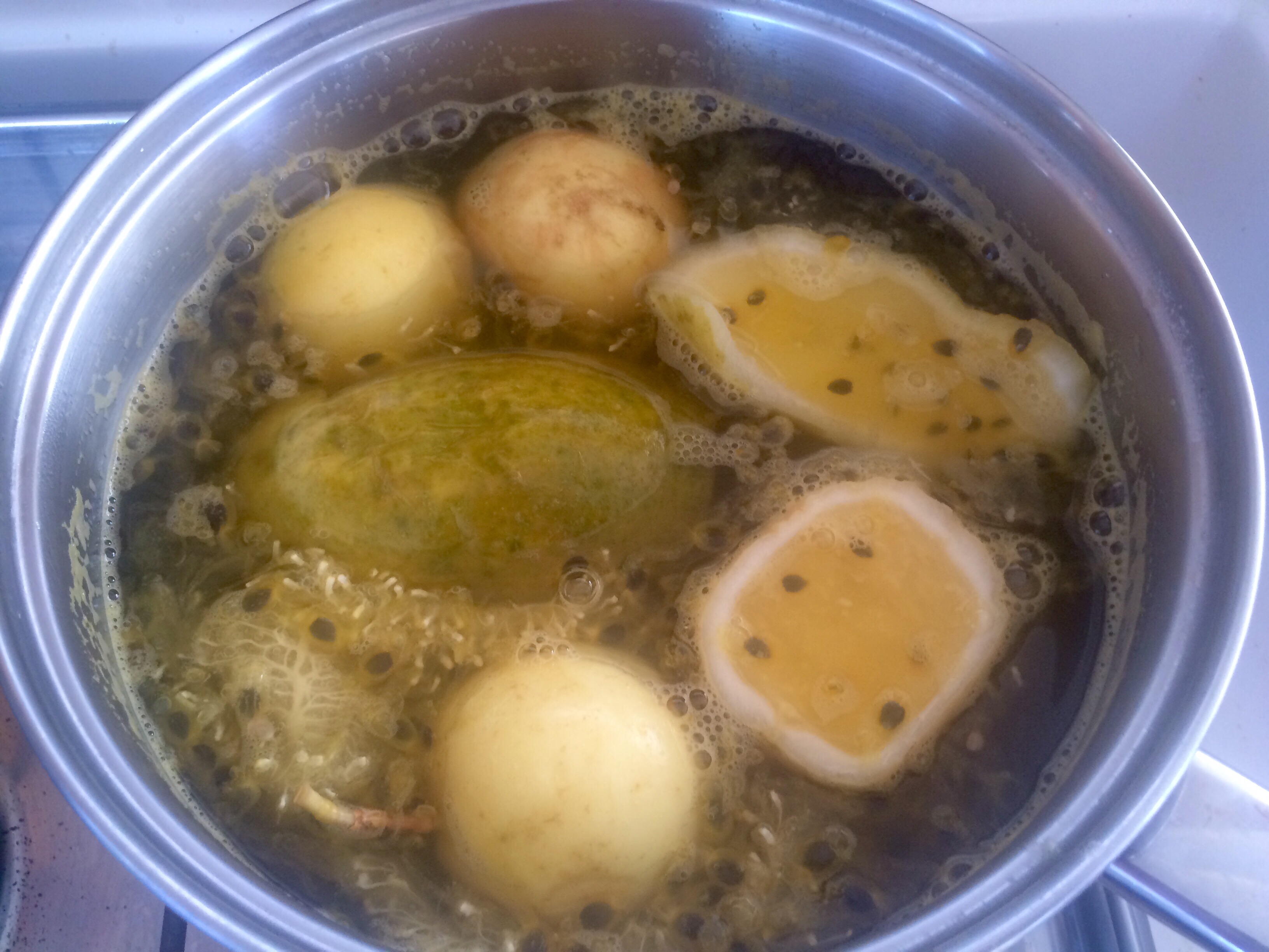 We use the fresh items to make whatever we can. Here I am simmering passion fruit and sugar cane to make an all natural Passion Fruit Juice.  No chemicals or high fructose corn syrup here!!!