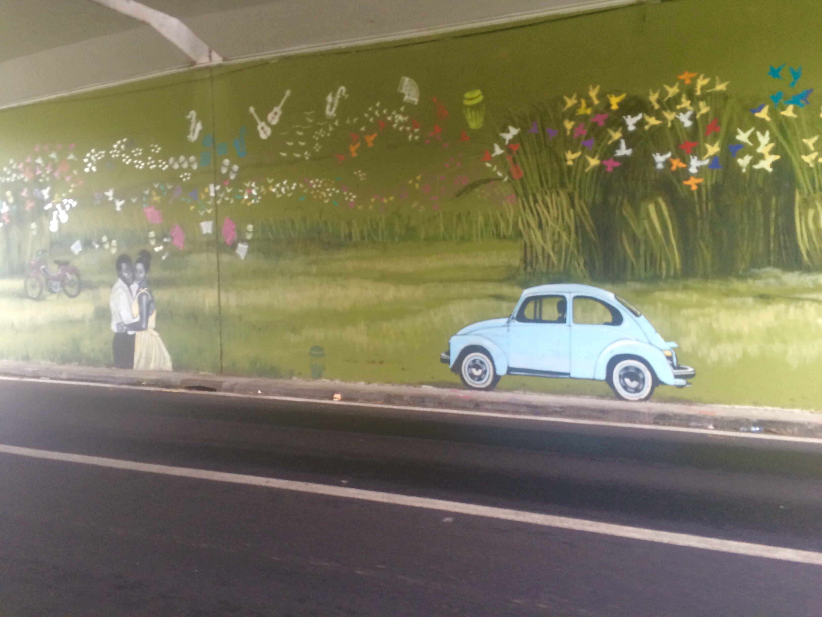 A cute picture painted on a wall under a bridge