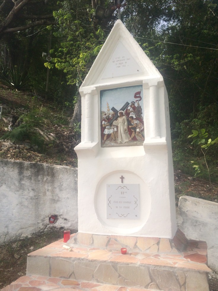 At each of the 12 turns, there is a monument with the stations of the cross and people kneeling and praying along the way.