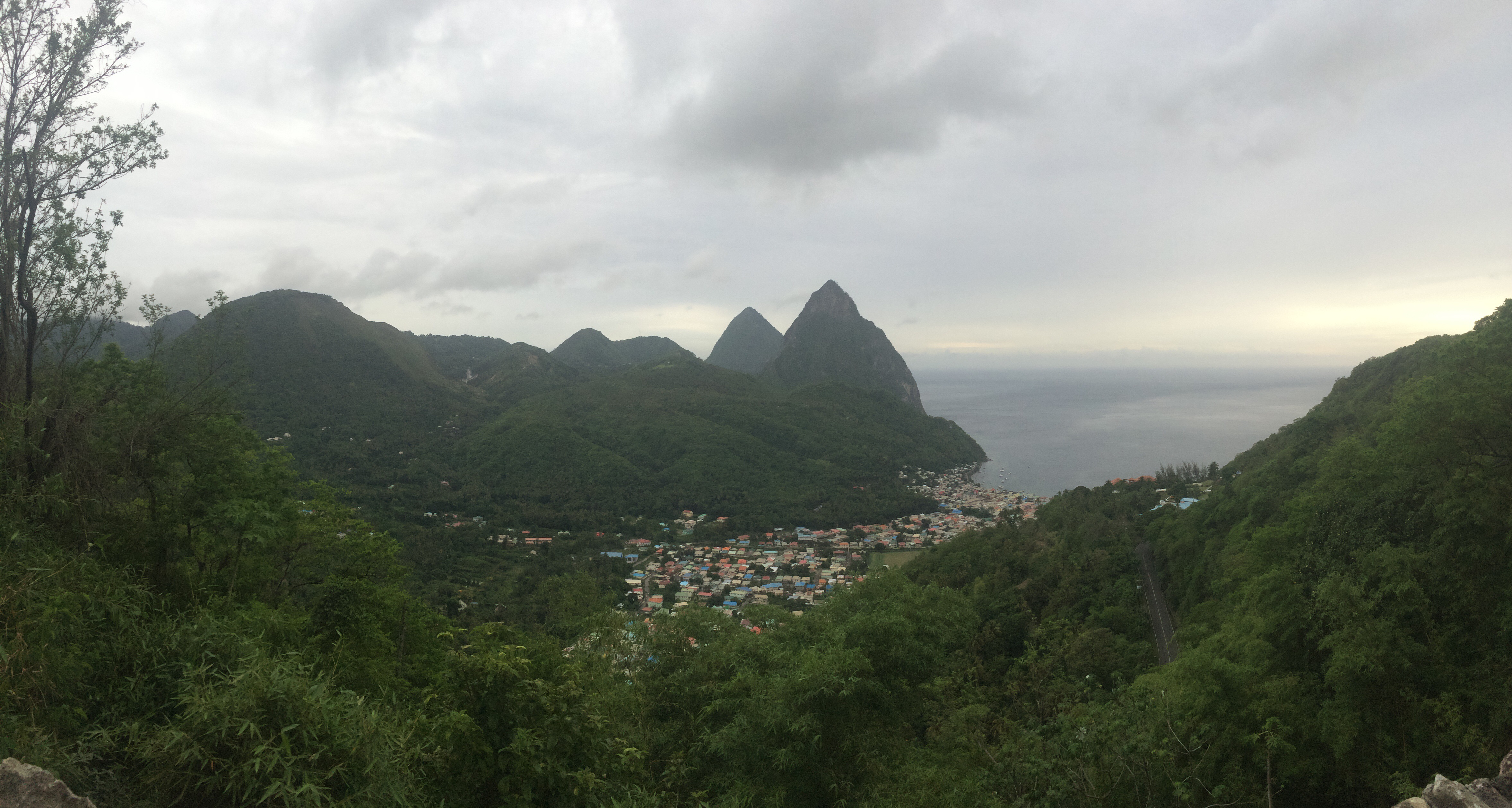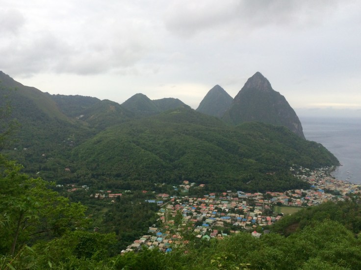View of the Pitons and the town of Soufrierre.
